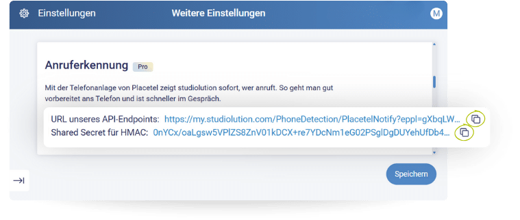 Geht in studiolution auf „Einstellungen“ > „Weitere Einstellungen“ > „Anruferkennung“. Klickt auf „Anruferkennung einrichten“. Jetzt erscheinen zwei Werte. Diese braucht ihr gleich für Placetel – zum Kopieren klicken.