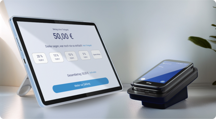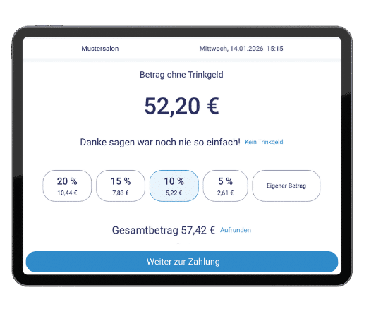 Trinkgeld wird immer häufiger per Karte, Handy & Co. gegeben. Beim Kassieren muss Trinkgeld deshalb aktiv angesprochen werden, bevor der Zahlbetrag eingegeben wird. Fällt es der Kund:in erst nach dem Kassiervorgang ein, muss womöglich storniert werden oder nachkassiert werden. Für studiolution Pay Nutzer gibt es deshalb die Möglichkeit ein separates Kundendisplay (z.B. Tablet) hinzustellen, mit dem die Endkunden ihren Trinkgeldbetrag selber erfassen können.