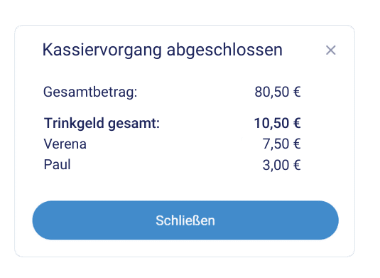 Sind mehrere Mitarbeiter:innen mit Leistungen und/oder Produkten an einem Beleg beteiligt, wird das Trinkgeld anteilig nach Umsatz verteilt. Dafür werden die Umsätze pro Mitarbeiter:in zusammengerechnet und das Trinkgeld entsprechend aufgeteilt.