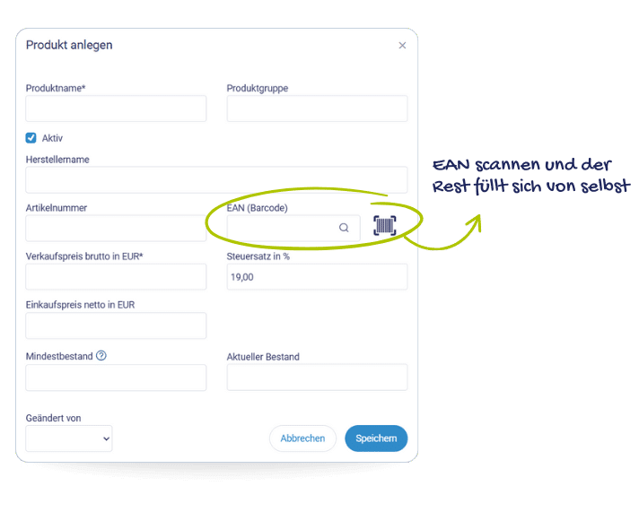 Tipp: Wenn ihr nicht alles eintippen wollt, könnt ihr einfach nur den EAN (Barcode) scannen oder abtippen und auf die Lupe klicken. Schon füllen sich alle anderen Felder wie von selbst aus! Alternativ können wir euch auch gängige Produktlisten einspielen.