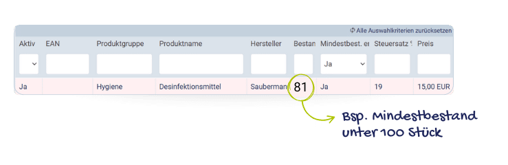 Ihr könnt für jedes Produkt in den Stammdaten einen Mindestbestand einstellen. Sobald dieser erreicht ist, wird: