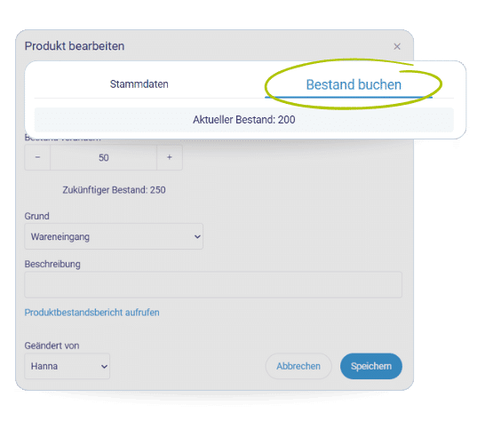Im Reiter „Bestand buchen“ könnt ihr eure Bestandsveränderung hinzu- oder ausbuchen – zum Beispiel bei Lieferungen oder wenn mal was kaputtgeht. Im Feld „Beschreibung“ könnt ihr Details zur Veränderung hinzufügen, sodass ihr den Vorgang nachvollziehen könnt. Diese erscheinen später im Produktbestandsbericht unter „Bemerkung“.