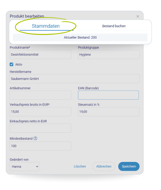 Jetzt speichert ihr das Produkt und klickt es in der Liste nochmal an. Das Menü heißt nicht mehr „Produkt anlegen“, sondern „Produkt bearbeiten“. Nun stehen euch zwei Reiter zur Verfügung: „Stammdaten“ und „Bestand buchen“. In den Stammdaten findet ihr alles, was ihr bereits ausgefüllt habt, falls ihr zum Beispiel den Verkaufspreis anpassen wollt. Darunter findet ihr einen Balken mit dem aktuellen Produktbestand.