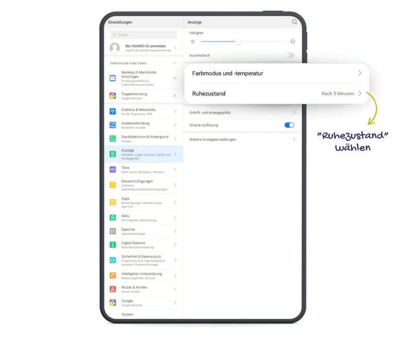 Tipp: Meistens gibt es in den Einstellungen eine Suchleiste, darüber könnt ihr auch versuchen, das Menü zu finden. Nutzt Suchbegriffe wie „Display“, „Ruhemodus“ oder „automatische Bildschirmsprerre“