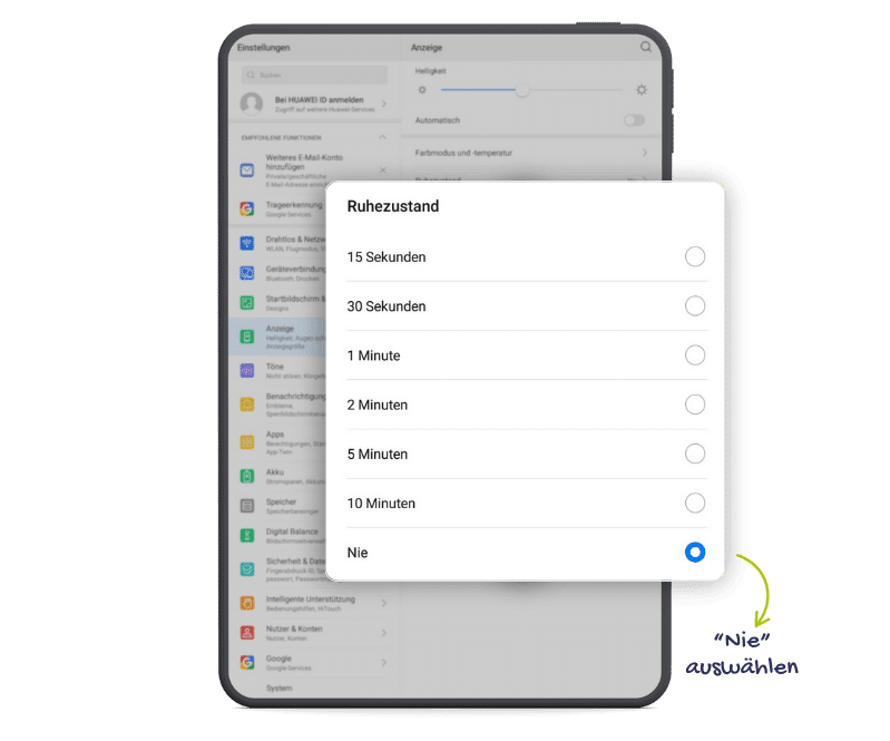 Damit euer externes Display dauerhaft sichtbar bleibt, müsst ihr verhindern, dass sich das Tablet automatisch sperrt oder in den Ruhemodus geht. Je nach Gerät ist der Weg etwas unterschiedlich – wir zeigen euch hier die beiden gängigsten Varianten: