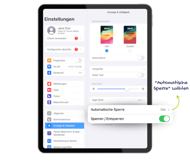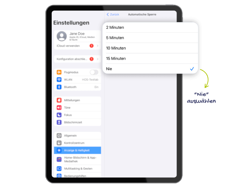 ➡️ Euer iPad bleibt nun an, bis ihr es manuell über den Ein-/Aus-Knopf sperrt.