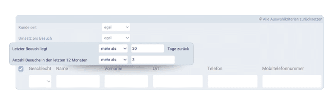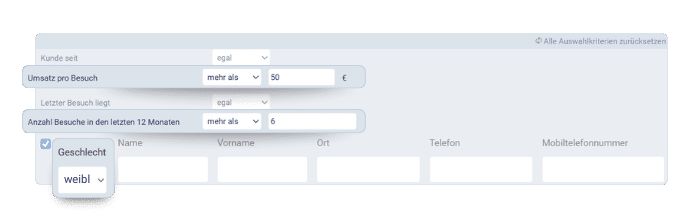 Ihr möchtet eure umsatzstärksten, weiblichen Kund:innen zu einem Kosmetik-Abend einladen. Diese Kund:innen sollen regelmäßige Besucher:innen eures Salons sein. Ihr könnt mit den Filtern natürlich spielen. Falls ihr kein Gefühl dafür habt, was „umsatzstark“ bedeutet, gibt einfach mal unterschiedliche Zahlen bei Umsatz pro Besuch ein.