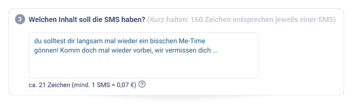 - Kurz halten: Eine SMS umfasst 160 Zeichen. Ihr könnt natürlich auch mehr schreiben – dann wird eure Nachricht jedoch in mehrere SMS aufgeteilt. Dadurch erhöht sich automatisch die Anzahl der versendeten SMS und damit auch die Kosten (z. B. statt 7 Cent → 14 Cent bei zwei SMS).