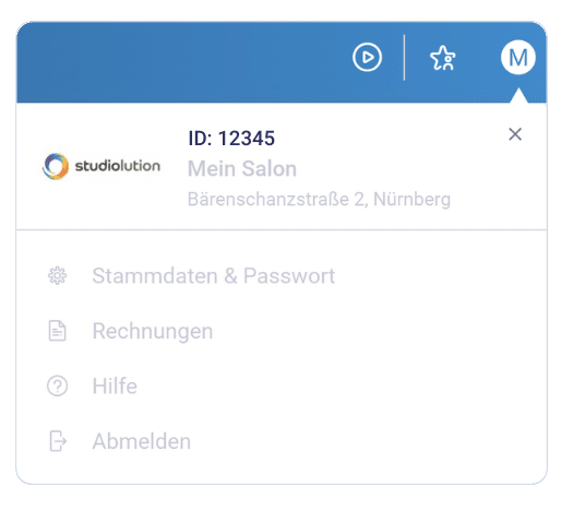 Klickt oben rechts auf den Kreis mit dem Buchstaben. In dem Fenster, das sich öffnet, findet ihr über dem Salonnamen eure persönliche, individuelle studiolution ID.