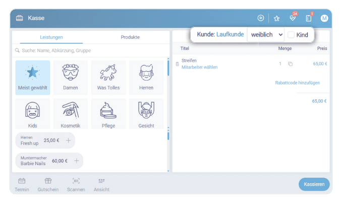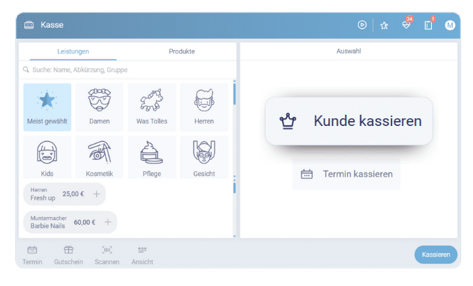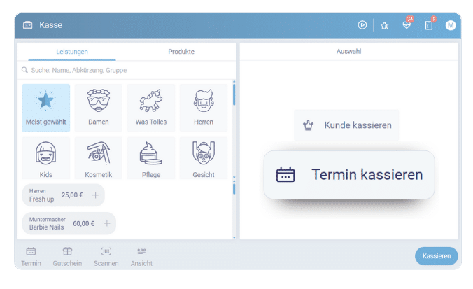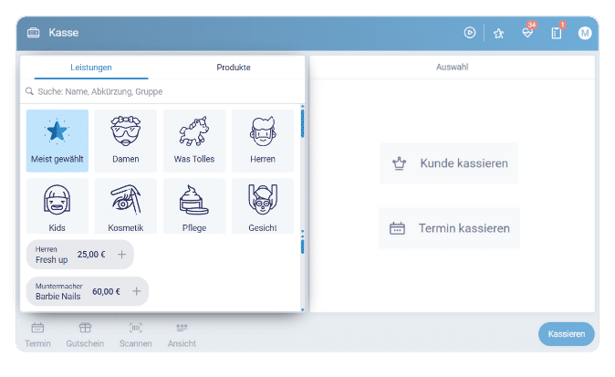 In die Kasse könnt ihr links einfach direkt eine Leistung oder ein Produkt auswählen.