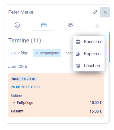 Öffnet die Kundenkartei, wählt die jeweilige Kund:in aus und geht auf das Terminbuch-Symbol. Dort könnt ihr euch nur die vergangenen Termine anzeigen lassen. Nicht kassierte Termine werden in rot hervorgehoben. Klickt in der Terminbox oben rechts auf die drei Punkte und wählt die Option „Kassieren“.