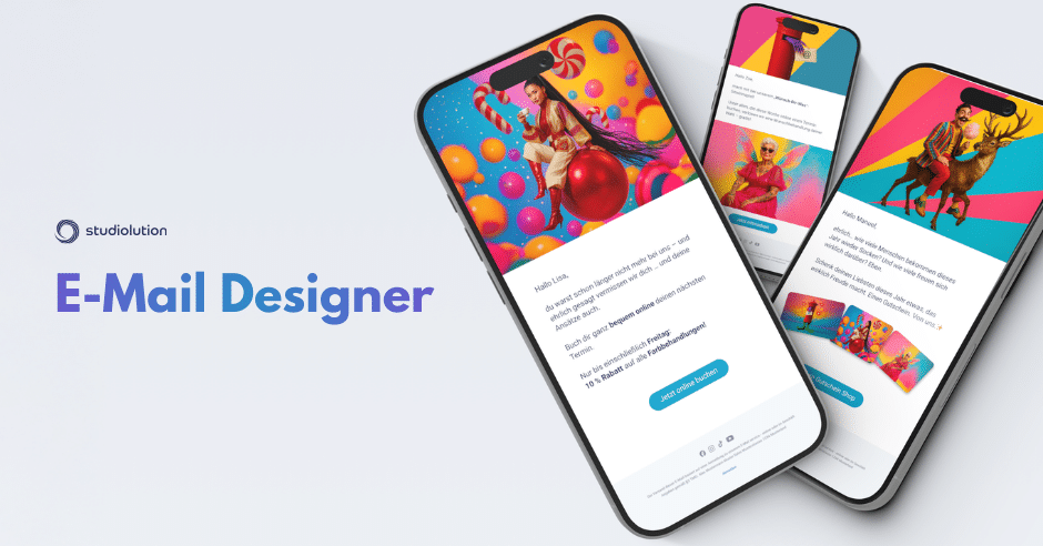 Professionelle E-Mails, die eure Kund:innen gerne ansehen? Genau dafür gibt’s den neuen E-Mail Designer. Mit Bildern, Farben, Buttons und auf Wunsch mit euren eigenen Bildern (studiolution Pro).