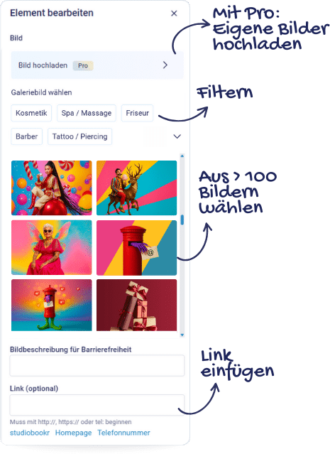 Über 100 Bilder zur Auswahl – sauber sortiert nach Themen. Auf Wunsch mit Link oder Alternativtext. Mit studiolution Pro könnt ihr auch eigene Bilder nutzen.