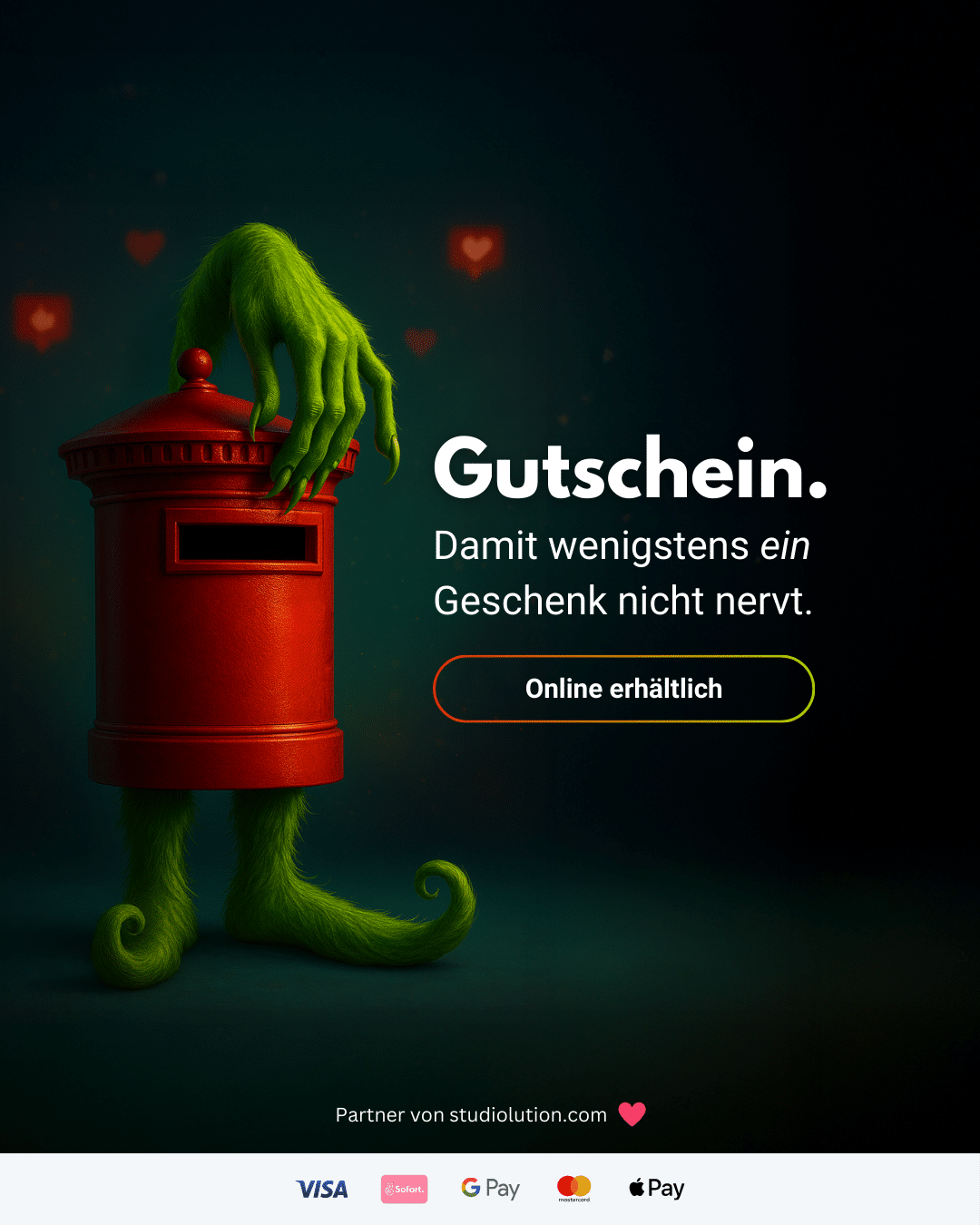 Ob Weihnachtsfan oder Grinch im Herzen – ein Gutschein geht immer! Im Online-Shop entsteht in wenigen Schritten ein personalisiertes Wohlfühl-Geschenk: bequem erstellt, sofort bezahlt, direkt per E-Mail erhalten und bei Bedarf ausdruckbar. Ein Geschenk, das nicht nervt, nicht einstaubt und selbst dem Grinch ein Grinsen ins Gesicht zaubert. 🎁 #Weihnachten2025 #Weihnachtsgeschenke #Gutschein #LastMinuteGeschenk #Weihnachtszeit #Geschenkidee #Gutscheinshop #studiolution #studiolutionxmas25